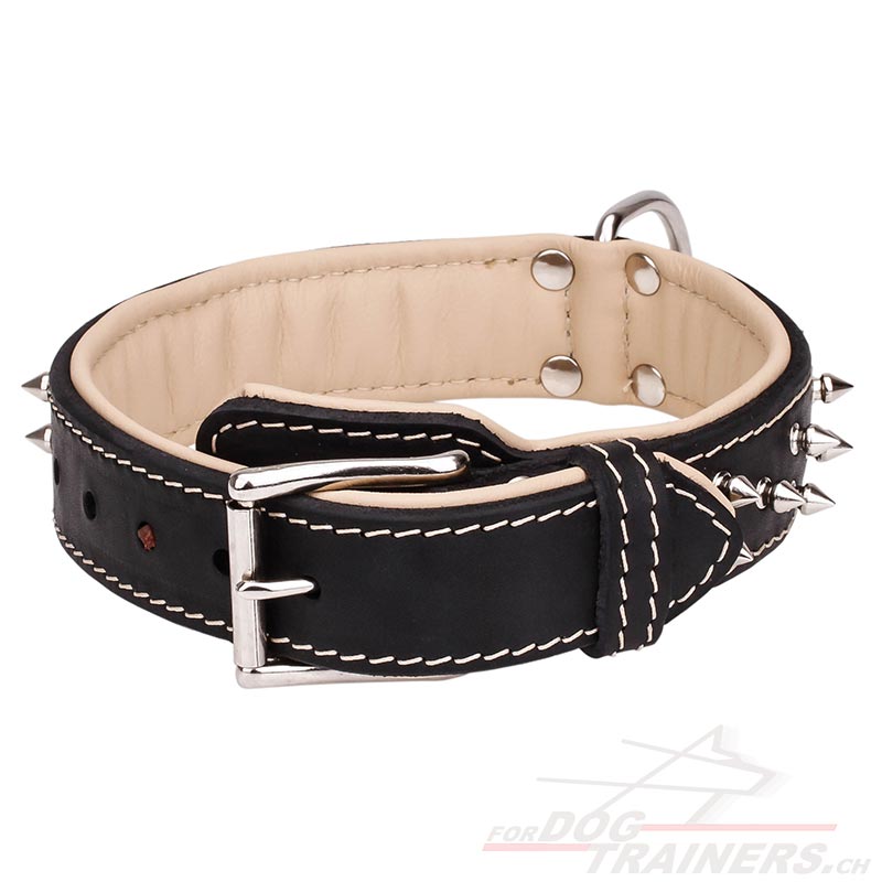 Hundehalsband mit vernickelten Spikes und innen Nappaleder-Polsterung.